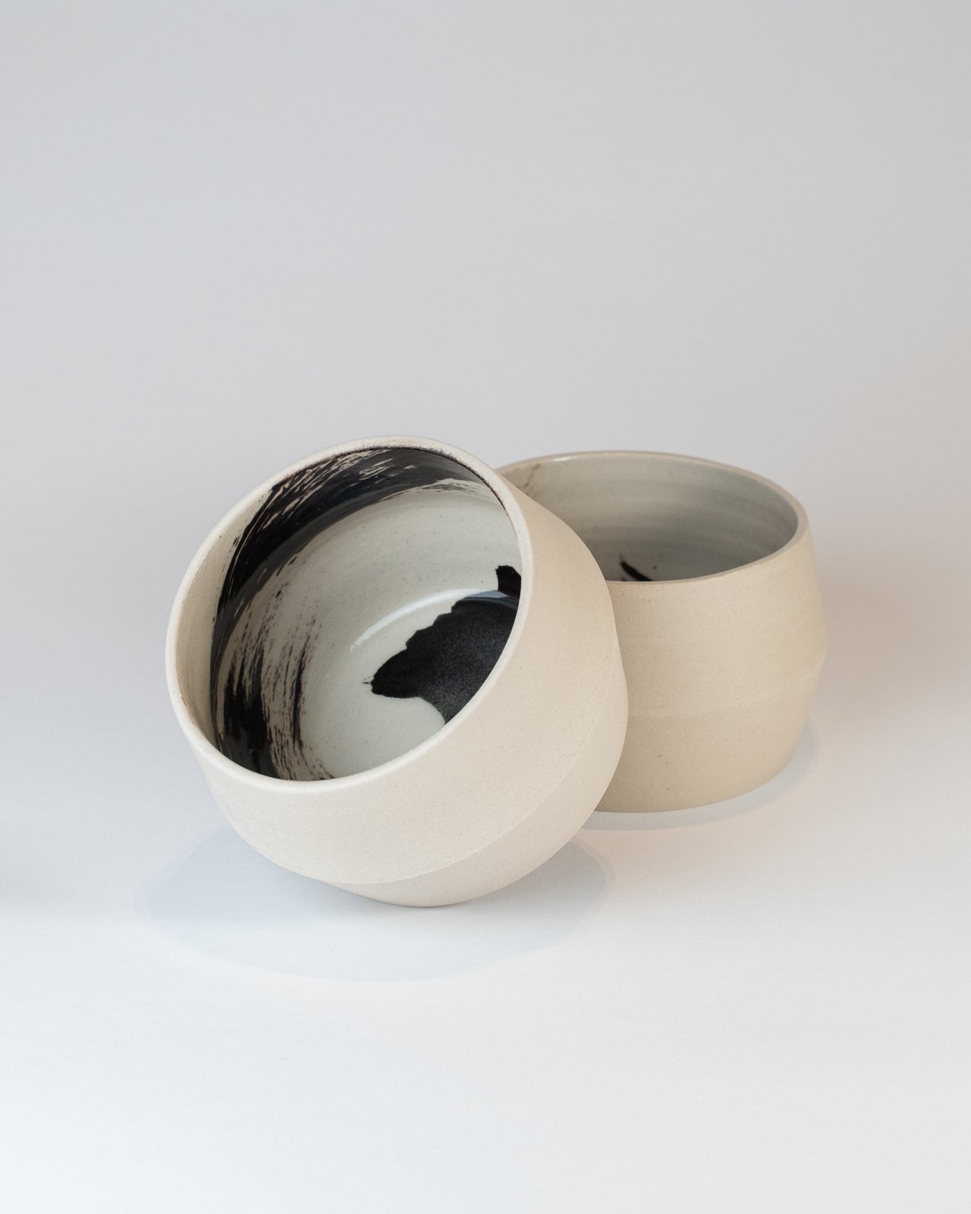 Made from cream/white clay, finished in our Transparent (black brush stroke) glaze and left raw on the outside. The silhouette is shaped in our Edge profile.